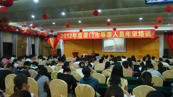 在市旅游局的指导下,厦门旅游培训中心具体承办2012年度的厦门市导游人员的年审培训工作,认真总结历年年审培训经验,努力打造,使之成为导游学习的重要平台。 分析导游结构,分级分对象培训 据统计,截止2012年12月12日,厦门市持有导游证的人员约为4230人,其中高级导游员17人,中级导游员409人,初级导游员3804人。其中约有70人是持有导游证的各旅行社总经理、副总经理级别的管理人员。不同级别的导游知识与技能水平存在较大的差异,一线导游与管理者导游的培训需求也存在差别。为此,培训中心采取了分层次分对象要求,初、中、高级导游员在培训学分与论文方面要求均有差别,针对管理者还开设了《中国旅行社的PEST分析》的专题培训,提高了培训的针对性。据统计,2012年度厦门导游年审培训共举办27期现场培训,可供预约共11785人次,实际参训达7472人次以上。