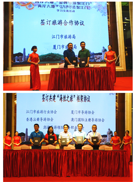9月18—20日,厦门、江门、香港、澳门、金门及澎湖两岸六地“金牌导游”汇聚江门进行学习交流活动。本次活动主题为“一带一路,串起两岸六地风光无限;金牌导游,演绎中华文化源远流长”,旨在加强两岸六地区域合作,对内可以起到互送客源、互相促进的作用,对外可以打造区域品牌,共同开拓客源市场;同时可以由点及面,由浅入深,从导游学习交流扩展到六地全方位的旅游合作。厦门市旅游局陈桂林副局长出席了开幕式,并代表厦门市旅游局与江门市旅游局签订了《旅游合作协议》,今后两市将在旅游行业管理、共同打造海丝之旅精品线路、共同开发客源市场并联合对外宣传推介等方面加强合作。另外,两岸六地还共同签订了《共建“海丝之旅”框架协议》,并发布了《“江厦港澳金澎”导游共同宣言》。市旅游局行业管理处郭道圣副处长、市旅游质监所陈少明所长、厦门市导游协会张斌会长及我市部分历届导游大赛获奖导游、导游服务明星和导游协会骨干等随队参加了相关交流活动。